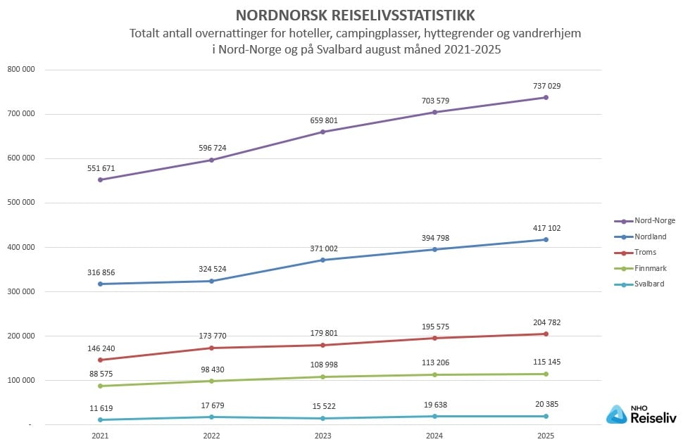 737 029 overnattinger på de nordnorske overnattingsbedriftene i august 2025, er en økning på 33 450 overnattinger fra august 2024. Dette innebærer en økning på 5 prosent. Norge totalt hadde en tilsvarende økning.