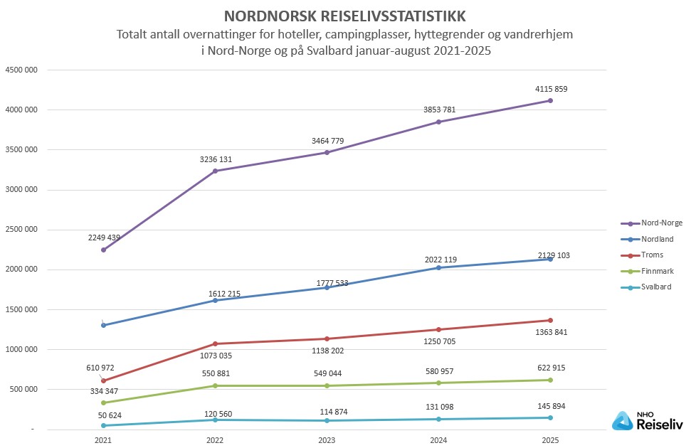 August-statistikken ble publisert fra SSB 1. oktober 2025 og er bearbeidet av Nordnorsk Reiselivsstatistikk – et prosjekt i regi av NHO Reiseliv Regionforening Nord-Norge. Se for øvrig www.ssb.no/statbank/list/overnatting for mer informasjon om utviklingen av samlet overnatting for regioner, kommuner og kommunegrupperinger.