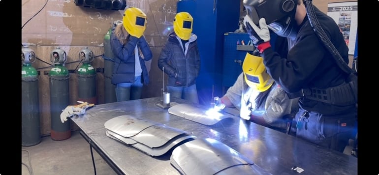 Jentene som besøkte Uvdal Maskinfabrikk fikk prøve seg på sveising – og var enige om at det var dagens høydepunkt. Foto: NHO Viken Oslo.