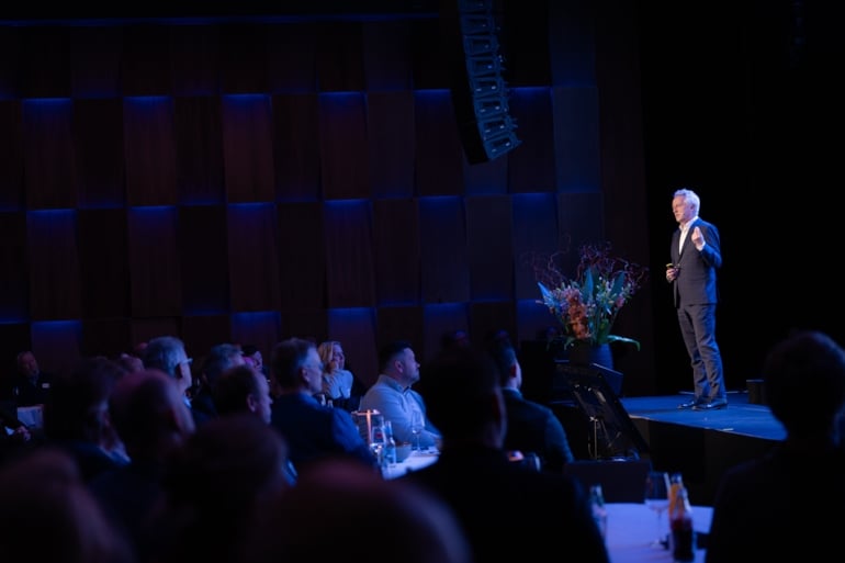 Ulf Sverdrup, professor ved Institutt for rettsvitenskap og styring ved Handelshøyskolen BI, på scenen under NHO Viken Oslos regionale årskonferanse. Foto: Leikny Havik Skjærseth.