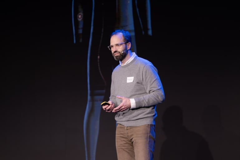 Christoffer Bauer, CEO og medgründer av Nåva Space, presenterte teknologien selskapet har utviklet. Den overvåker menneskelig belastning i ekstreme arbeidsmiljøer, og er utviklet med tanke på både romfart, forsvar og krevende industriarbeid.