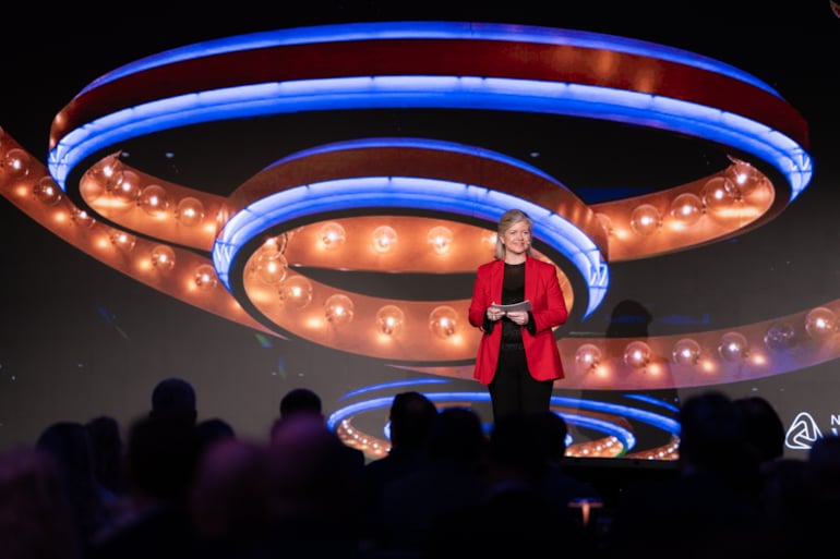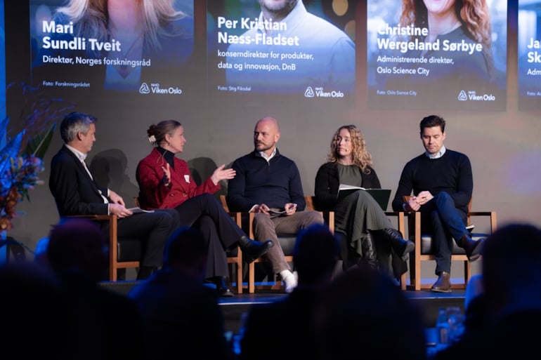 Kristian Enger, regiondirektør i NHO Viken Oslo, samlet Mari Sundli Tveit, administrerende direktør i Forskningsrådet, Per Kristian Næss-Fladset, konserndirektør for produkter, data og innovasjon i DNB, Jarle Skrebergene, CEO i Aize, og Christine Wergeland Sørbye, administrerende direktør i Oslo Science City, på scenen. Med utgangspunkt i NHO-rapporten Veien til vekst pekte Enger på at Norge taper terreng innen forskning, innovasjon, skalering og kommersialisering, samtidig som demografiske endringer og geopolitisk uro øker sårbarheten.