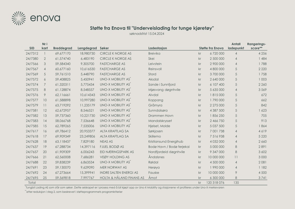 Dette er den andre tildelingen i støtteprogrammet fra Enova. Bare for ett år siden var infrastrukturen for lading av tunge kjøretøy i Norge lite utbygd. Hele 235 ladepunkter langs norske veier har mottatt støtte fra Enova siden da. Satsingen på underveislading kommer i tillegg til støtte til bedriftslading for tunge kjøretøy og støtte til tunge nullutslippskjøretøy.