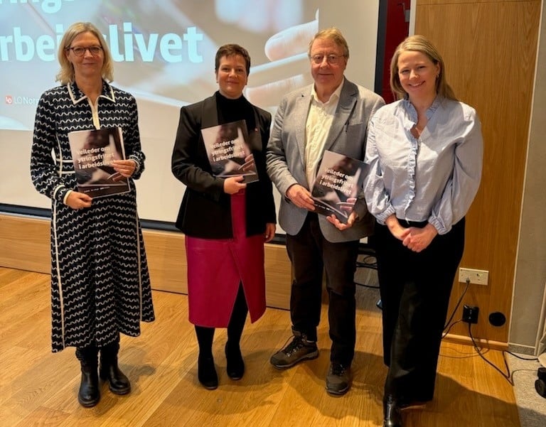 Nina Melsom (direktør arbeidsliv NHO), Henriette Jevnaker (første nestleder LO), Vidar Strømme (fagdirektør Norges institusjon for menneskerettigheter) og Mathilde Wilhelmsen (seniorrådgiver NIM).