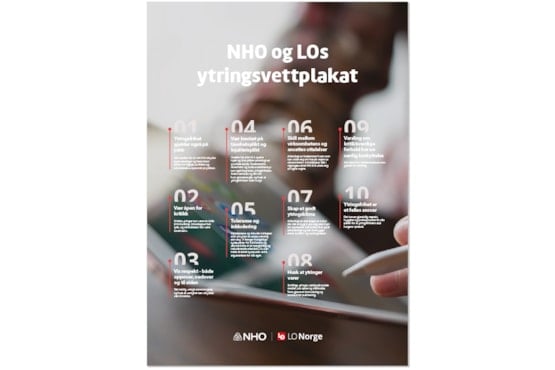 Veilederen er laget i samarbeid med Norges institusjon for menneskerettigheter (NIM) og skal være et verktøy i partssamarbeidet på den enkelte arbeidsplass. LO og NHO har også laget en ytringsvettplakat med ti punkter som kan printes ut og henges opp på den enkelte arbeidsplass.